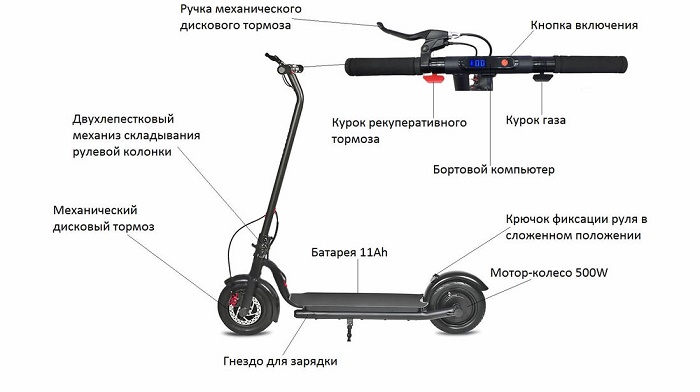 • Тормозная система – есть электрический тормоз, рычаг от которого находится на руле, а также фрикционный тормоз, который работает, когда нажимаешь ногой на заднее крыло;